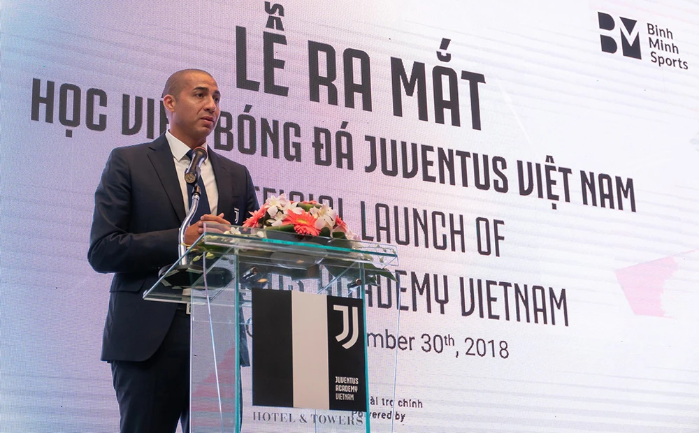 Cựu danh thủ Juventus David Trezeguet phát biểu tại lễ ra mắt học viện.