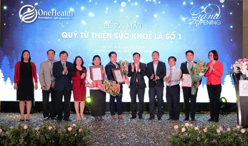 Đại diện Bộ Nội Vụ và các lãnh đạo cơ quan ban ngành trao quyết định thành lập quỹ từ thiện Sức khỏe là số 1. Ảnh: Trần Huấn