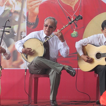 Danh cầm Ba Tu khoe ngón đàn tài tử điêu luyện của ông trên sân khấu.