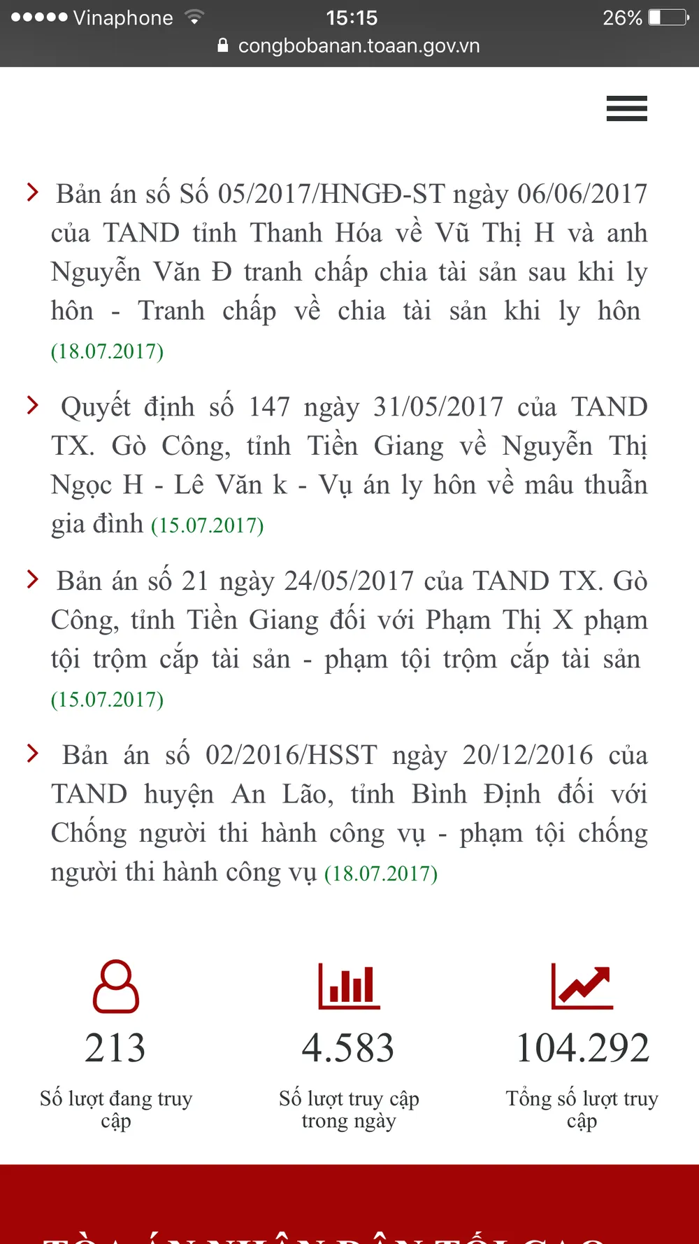 Trao đổi thêm, một lãnh đạo TAND TP.HCM cho biết hiện có 10 bản án, quyết định của tòa địa phương mình được công bố trên trang này. Ngoài ra, theo nguyên tắc, nếu đương sự có yêu cầu không công bố nhưng không thuộc trường hợp cấm theo luật định thì vẫn công khai bản án, quyết định đó...