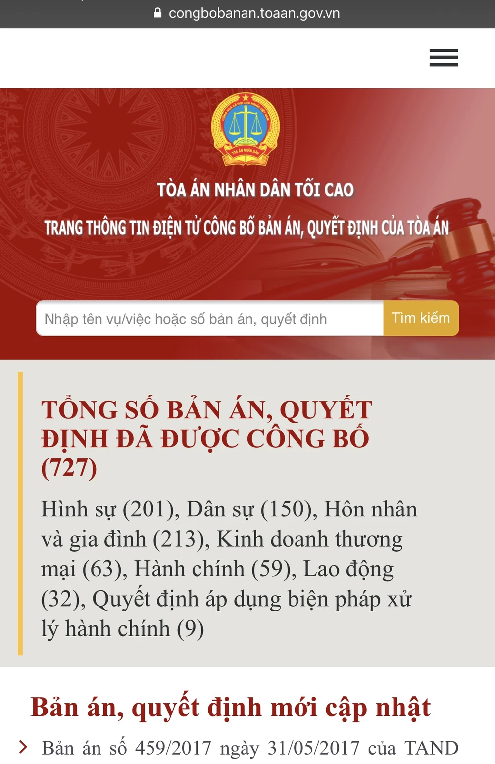Với trang điện tử này, người dân, cơ quan, tổ chức có thể tìm kiếm, xem trực tiếp nội dung các bản án, quyết định đã công bố thuộc các lĩnh vực liên quan, các án lệ được áp dụng.