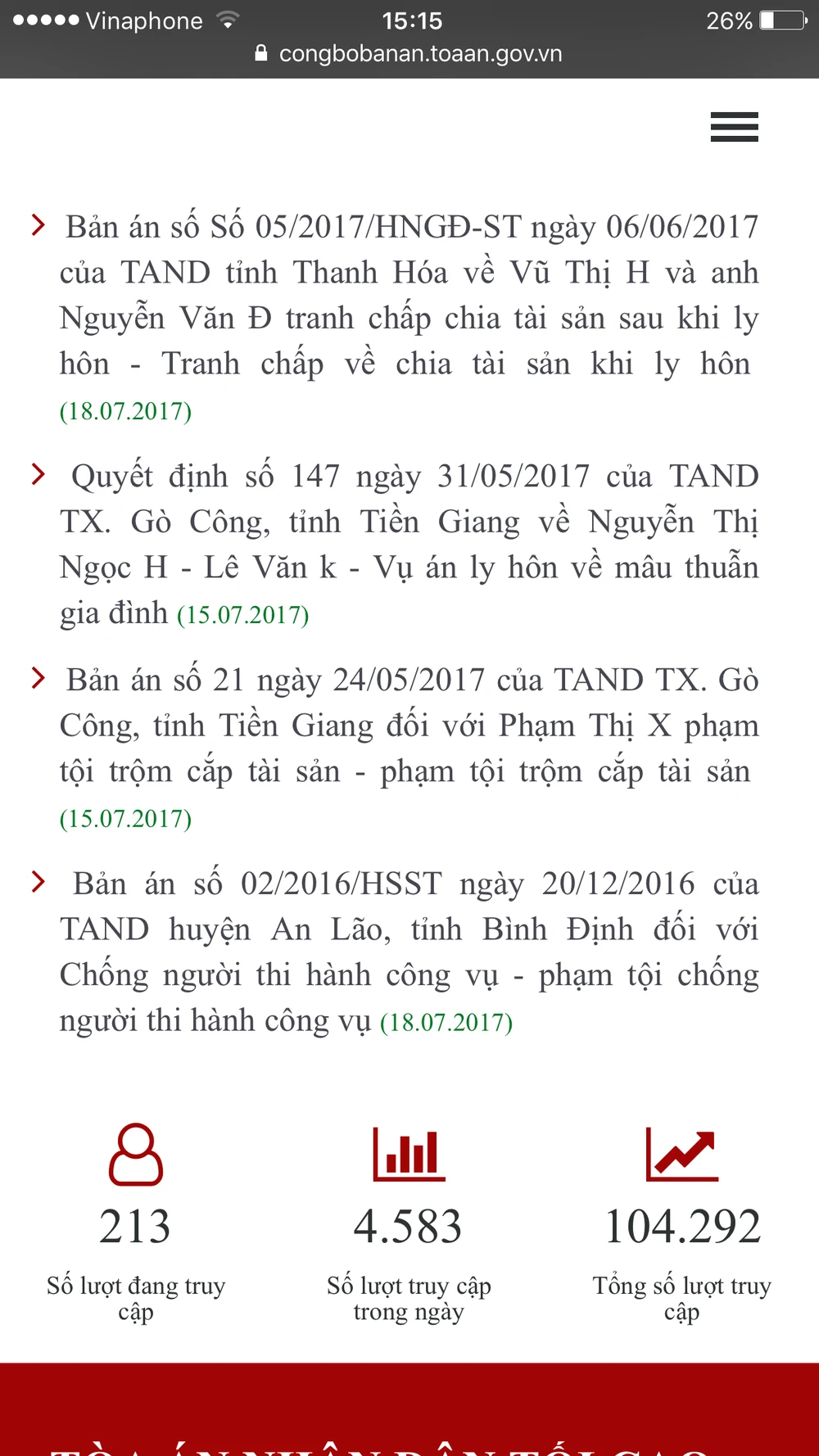 Thông cáo báo chí của TAND Tối cao cho biết tại thời điểm sáng 18-7, đã có gần 700 bản án, quyết định có hiệu lực được công bố trên trang https://congbobanan.tòaan.gov.vn,