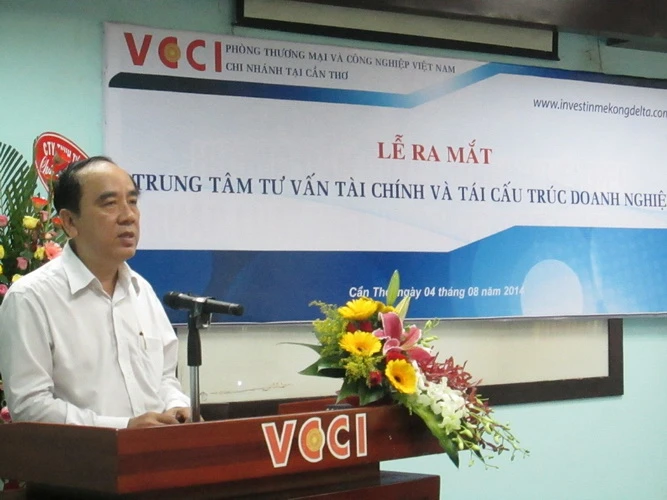 Giám đốc VCCI Cần Thơ phát biểu tại buổi ra mắt Trung tâm tư vấn tài chính và tái cấu trúc doanh nghiệp ngày 4-8. Ảnh: N.NAM