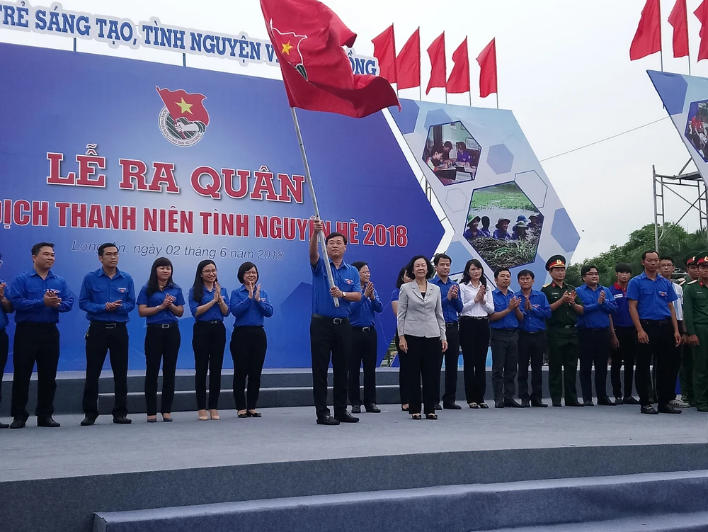 Bà Trương Thị Mai trao cờ cho ông Lê Quốc Phong, Bí thư thứ nhất Trung ương Đoàn TNCS Hồ CHí Minh, chính thức khởi động Chiến dịch Thanh niên tình nguyện 2018.
