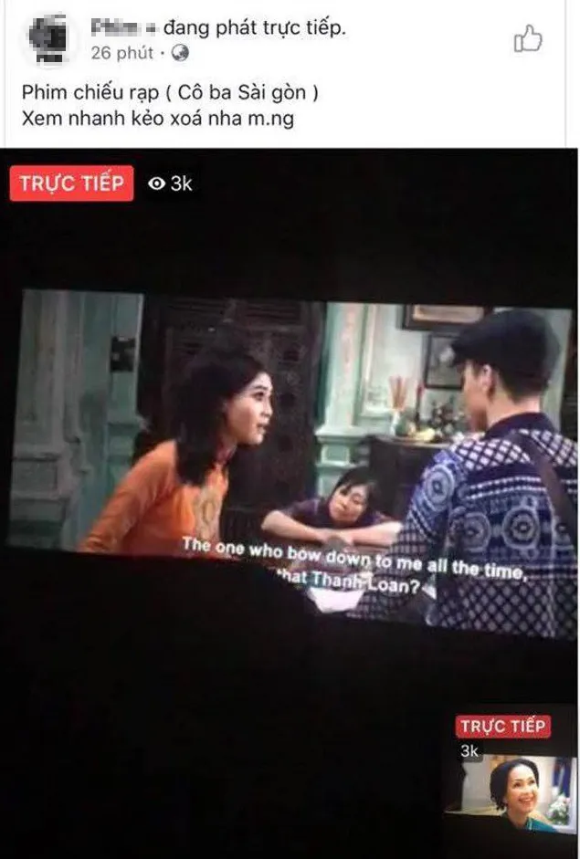 Vừa qua, thành viên của một trang Facebook yêu điện ảnh đã quay lén nội dung bộ phim điện ảnh Cô Ba Sài Gòn đang được công chiếu tại các rạp và phát trực tiếp (livestream) trên Facebook. Đoạn clip này đã thu hút hàng ngàn lượt xem trong thời lượng khoảng 30 phút.