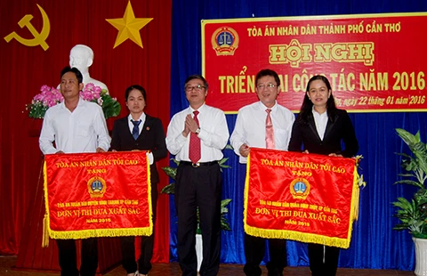 Phó Chánh án TAND Tối cao Nguyễn Sơn (giữa) trao cờ thi đua cho TAND quận Bình Thủy và TAND huyện Vĩnh Thạnh. Ảnh: CTV