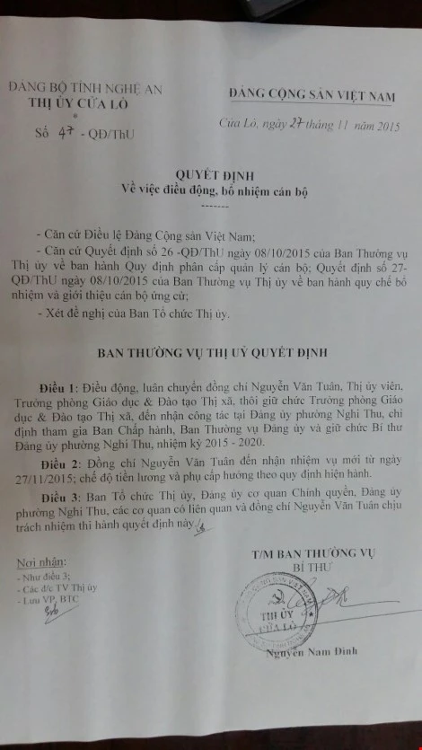 Như đã đưa tin, ngày 27-11, ông Nguyễn Nam Đình, Bí thư Thị ủy Cửa Lò ký quyết định điều động, luân chuyển ông Tuân - Trưởng Phòng GD&ĐT thị xã Cửa Lò đến làm Bí thư Đảng ủy phường Nghi Thu, từ ngày 27-11.