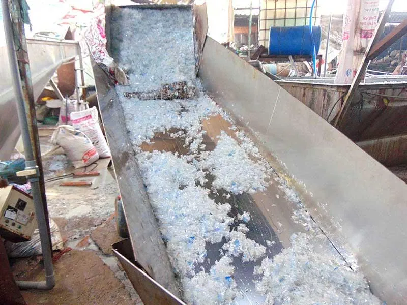 Tại đây, hàng trăm bao tải đựng vỏ chai nhựa chất đống. Một phụ nữ ngồi xổm đang xé bỏ nhãn trên thân chai, gần đó là băng chuyền chuyển vỏ chai tới máy cắt đang chạy ầm ầm. Vỏ chai nhựa sau khi cắt thành mảnh nhỏ được chuyển qua hệ thống rửa sạch, làm khô và cho vào bao. Những người làm cho biết mảnh nhựa này sẽ được các cơ sở mua về kéo thành màng mỏng để sản xuất ly uống nước, hộp đựng bánh...