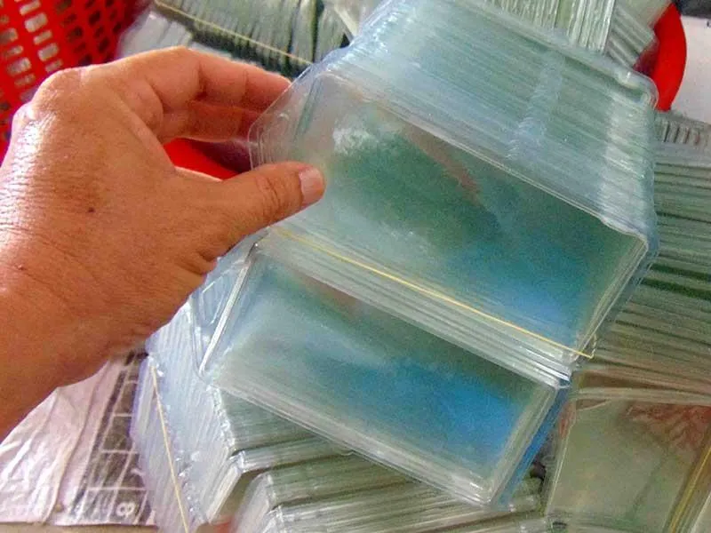 Hôm sau, PV đến cơ sở D trong vai người tìm mua tấm màng nhựa làm hộp đựng bánh. Trong lúc ngồi chờ chủ cơ sở về, PV thấy trong góc nhà dựng rất nhiều tấm màng nhựa. Gần đó, hai người liên tục đút tấm mành nhựa vào máy dập thành những hộp nhỏ.