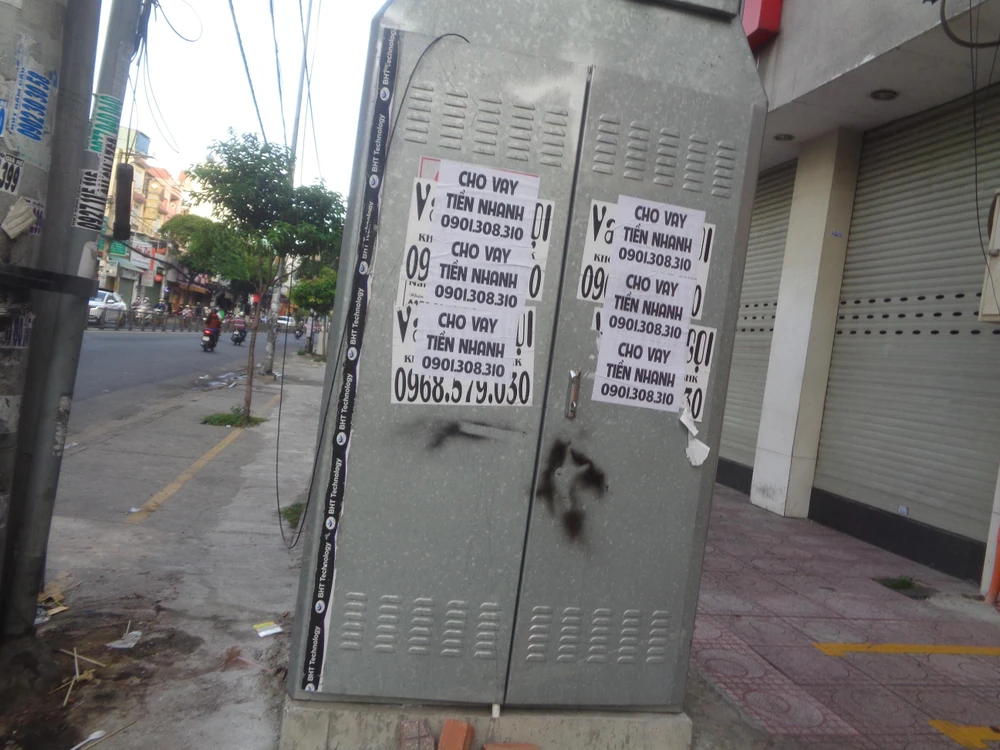 Kiểu cho vay tiền nhanh gọn này đã được báo chí đề cập rất nhiều với nhiều tiềm ẩn ủi ro cho các bên. Thế nhưng, những trụ đèn, trụ điện, tủ điện hạ thế ...bị dán nhan nhản những tờ rơi cho vay tiền kiểu này. Những tờ rơi cũ chưa được gỡ đi thì đã có nhiều tờ rơi mới dán chồng lên.