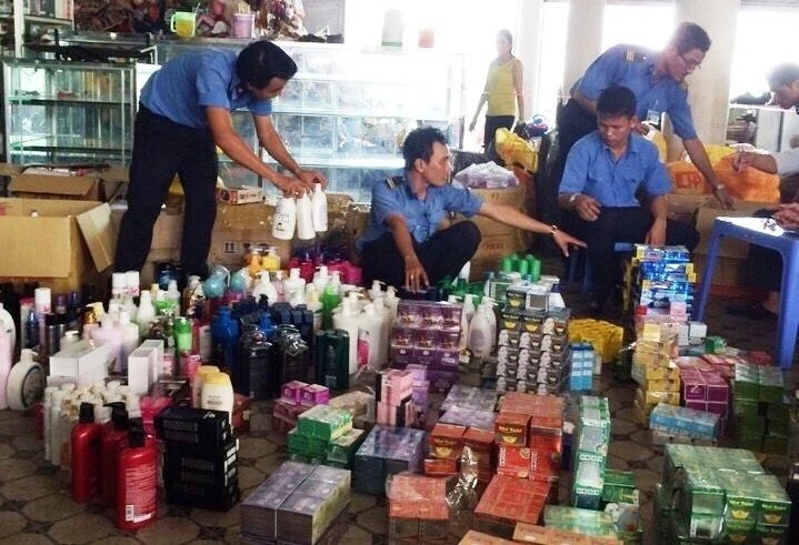 Cảnh thu giữ hàng mỹ phẩm tại quầy hàng của bà Ngọc. Ảnh: Cắt từ clip