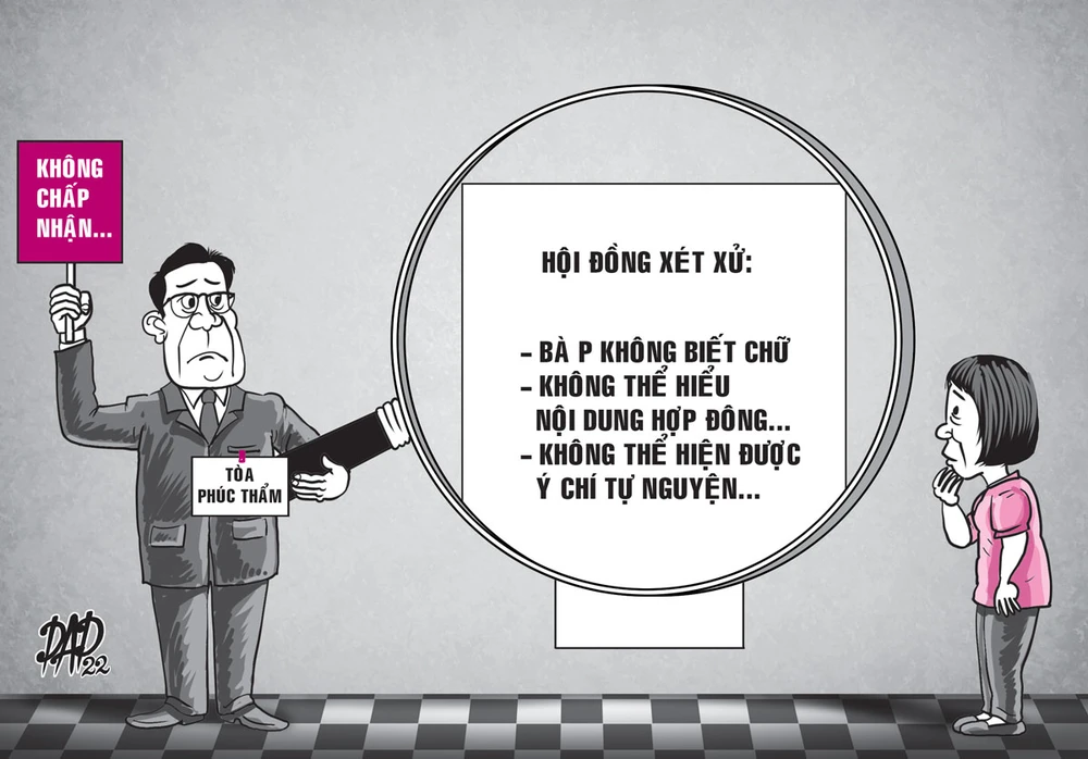 Trong đó, giao dịch dân sự có hiệu lực khi các chủ thể tham gia hoàn toàn tự nguyện. Bà P không biết chữ và không thể biết được nội dung hợp đồng do bà V soạn sẵn. Do đó, nội dung hợp đồng hoàn toàn là ý chí của bà V không thể hiện được ý chí tự nguyện của bà P. Hợp đồng này vô hiệu. Cạnh đó, việc giao tiền có hay không, giao trước hay giao sau đều không có căn cứ xác định.
