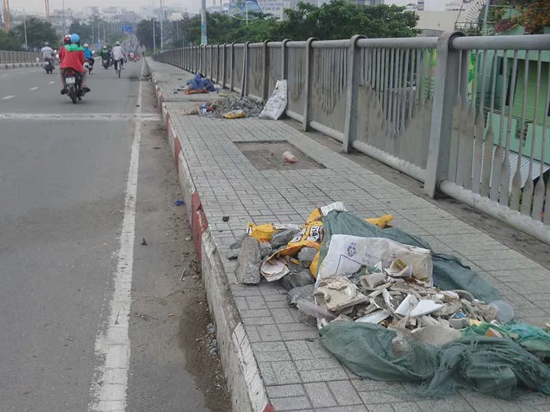 Những người ý thức kém đã đổ rác ngay đường bộ hành làm cản trở lối đi dành cho người đi bộ trên cầu.