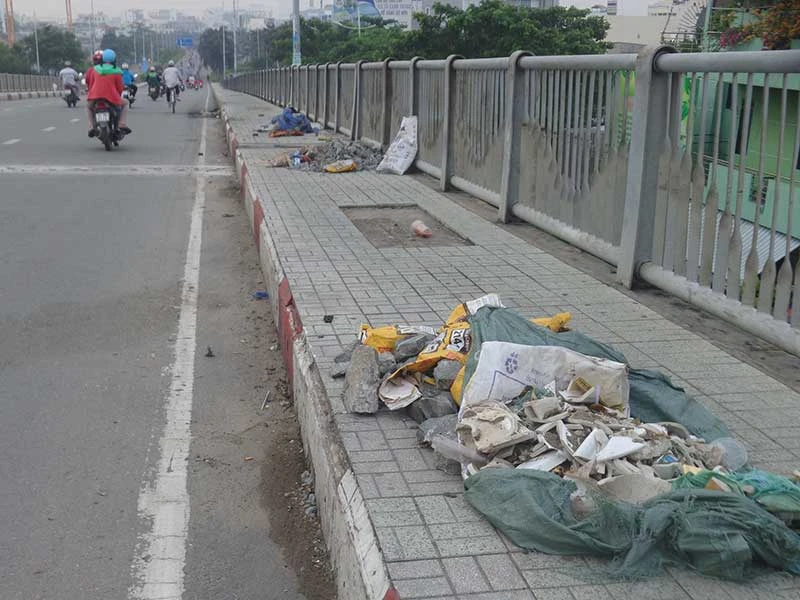 Hai bên đường bộ hành trên cầu Tân Thuận 2 (nối giữa quận 4 và quận 7), hướng từ đường Nguyễn Tất Thành, phường 18, quận 4 sang quận 7, TP.HCM xuất hiện nhiều đống rác và xà bần trải dài.
