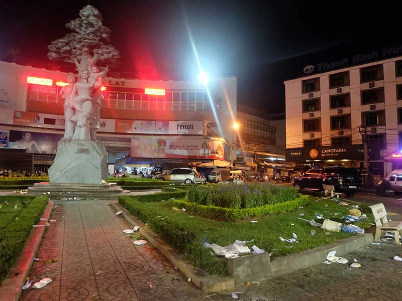 Ảnh chụp trước tượng đài Phụ nữ Đà Lạt, chợ Đà Lạt vào 5 giờ sáng 6-6-2017.