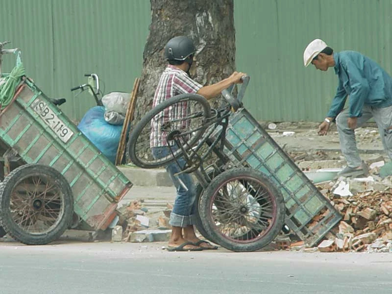 Hiện nay không ít hộ gia đình, chủ công trường thường thuê xe ba gác thu gom và đổ rác xây dựng ra các khu vực vùng ven, bãi đất trống. Ảnh: HTD