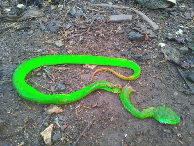 Một con rắn lục đuôi đỏ cỡ lớn bị nông dân hái cà phê phát hiện đánh chết.