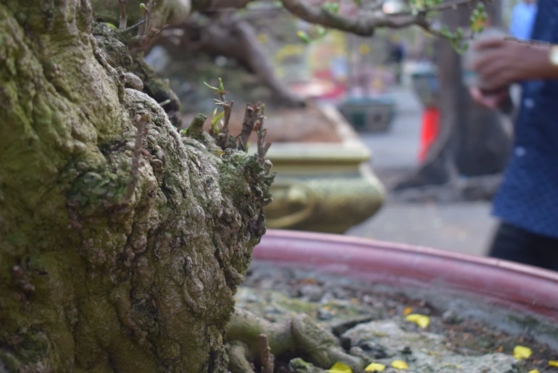 Anh Lớn cho biết cây mai đã hơn 200 tuổi, thân xù xì và đặc biệt quý ở dáng long (dáng rồng). Phần gốc sần sùi, phần vỏ cây lâu năm bám rêu xanh cổ kính.