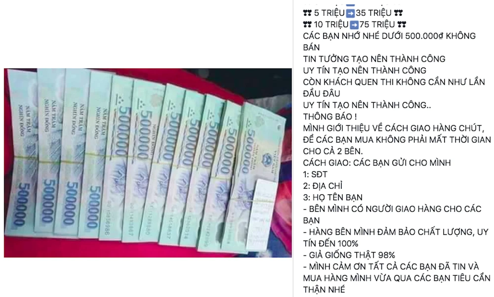 Đáng lo ngại, thời gian qua xuất hiện hiện tượng rao bán tiền giả trên Facebook một cách lộ liễu. Những dòng tin rao bán tiền giả này được đẩy lên các trang Facebook có lượng người theo dõi lớn.