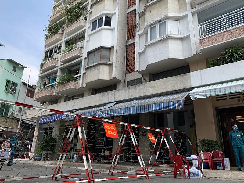 Một phần chung cư Sư Vạn Hạnh (quận 5, TP.HCM) được cách ly do liên quan đến ca mắc COVID-19. Ảnh: HOÀNG LAN