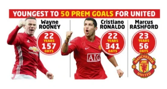 Rashford đạt cột mốc 50 bàn cho “quỷ đỏ” ở tuổi 23 và 56 ngày. Người đạt thành tích 50 bàn sớm nhất cho MU là Rooney khi anh 22 tuổi 157 ngày, còn Ronaldo ghi 50 bàn cho MU ở tuổi 22 và 341 ngày.