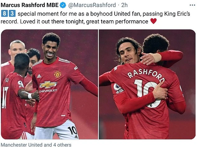 Cầu thủ 23 tuổi người Anh này hiện còn kém David Beckham 2 bàn thắng. Sau trận đấu, Rashford chia sẻ rằng việc anh vượt qua huyền thoại Cantona là một khoảnh khắc đặc biệt.