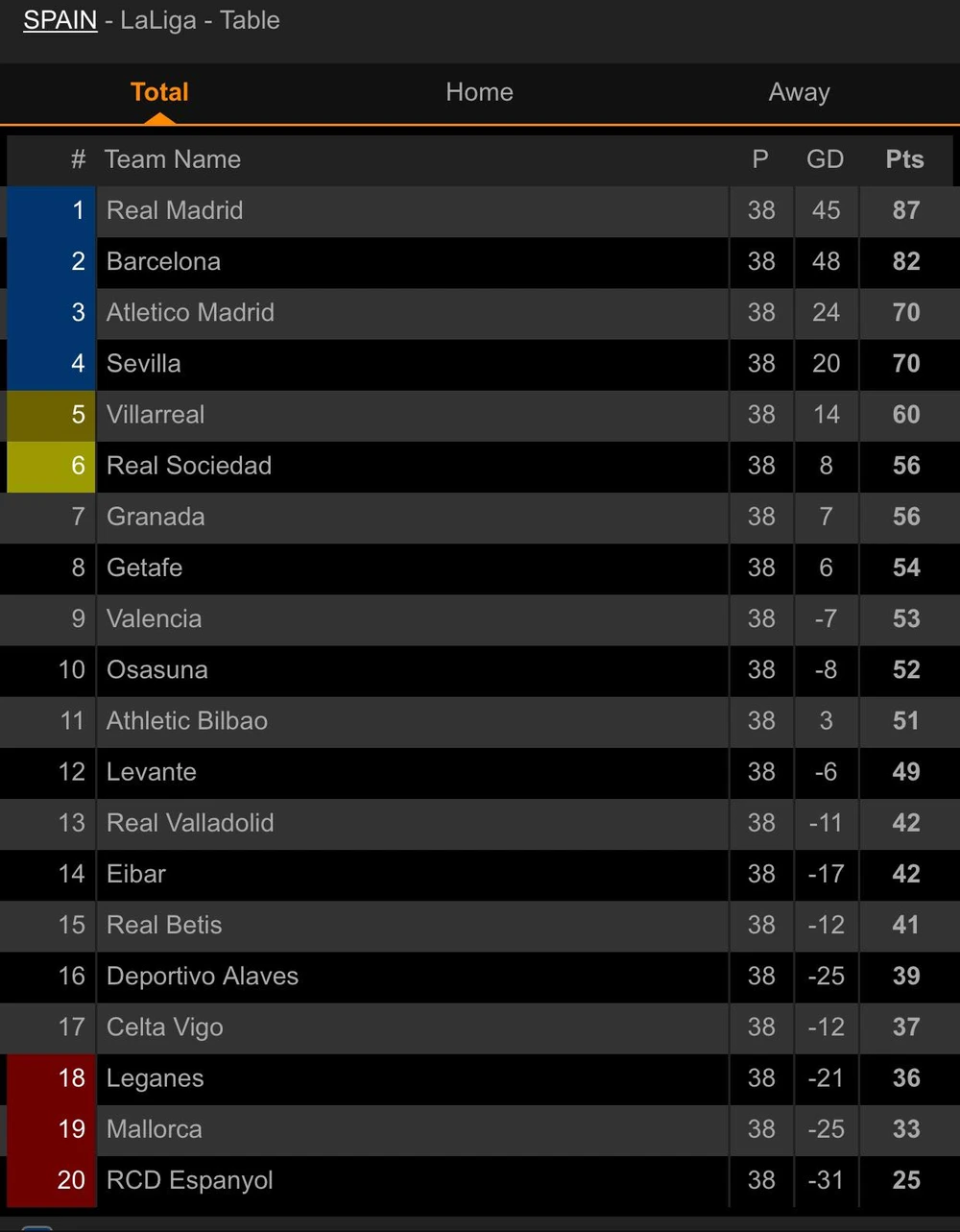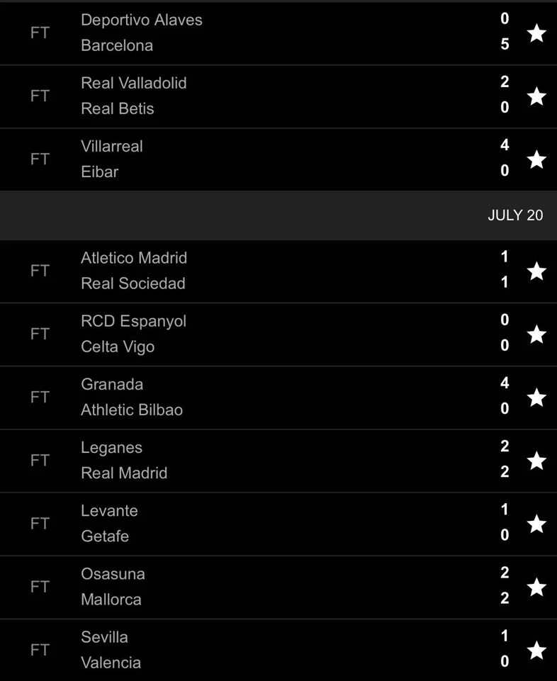 Vòng đấu cuối La Liga mùa giải 2019-2020 tạo nên nhiều kết quả bất ngờ đối với những đội bóng nằm trong top 4. Nếu như Barcelona giành chiến thắng tưng bừng với tỉ số 5-0 trên sân của Deportivo, thì ngược lại tân vương Real Madrid dù ra sân với đội hình cực mạnh nhưng lại chia điểm trước Leganes với tỉ số 2-2.