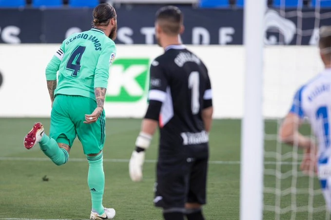 Ramos có được bàn thắng thứ 100 trong màu áo Real Madrid bằng pha bóng đánh đầu làm tung lưới Leganes. Ảnh: AS.
