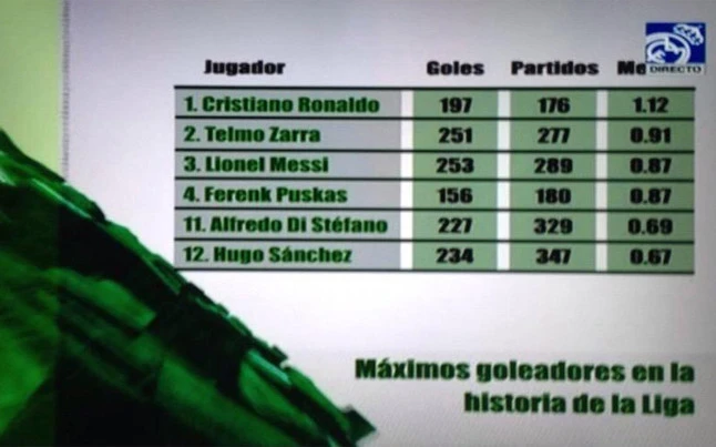 Điều hài hước là Real Madrid TV đã phát đi số liệu thống kê này ngay sau khi Messi phá vỡ kỷ lục tồn tại gần 60 năm của Zarra. Theo lý giải của Real, Ronaldo mới xứng đáng được vinh danh là chân sút vĩ đại nhất La Liga với phong độ ghi bàn không tưởng trong những năm qua.