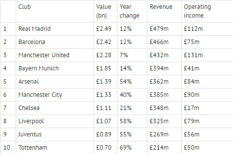 Manchester United là CLB ở Premier League có giá trị lớn nhất khi họ xếp thứ 3 với giá trị 2,28 tỉ bảng Anh. Có đến sáu CLB ở Premier League nằm trong tốp 10, ngoài Man United còn có Arsenal, Man. City, Chelsea, Liverpool và Tottenham. Hai đội còn lại nằm trong top 10 là Bayern Munich (thứ 4) và Juventus (thứ 9). Ngoài ra, West Ham và Newcastle là hai CLB khác của Premier League cũng năm trong tốp 20 cùng với các CLB lớn khác.