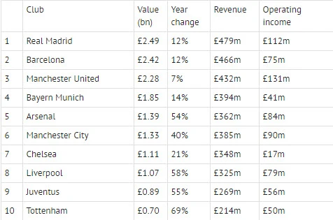 Theo danh sách của Fobes năm 2016, Real Madrid vẫn là đội bóng giá trị nhất thế giới. Đội bóng hoàng gia Tây Ban Nha hiện có giá 2,49 tỉ bảng Anh và đây là năm thứ tư liên tiếp họ đứng đầu danh sách của Forbes. Đứng ngay sau Real là đại kình địch Barcelona với giá trị 2,42 tỉ bảng Anh.