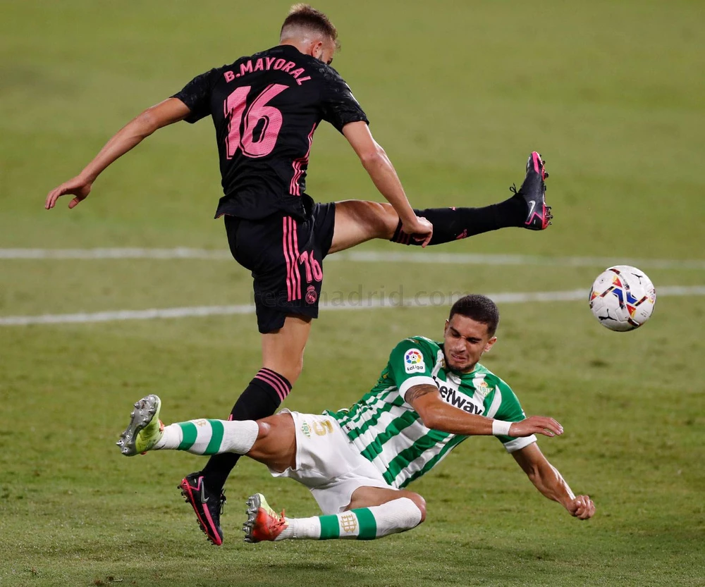Tình huống Mayoral dứt điểm chạm tay cầu thủ Betis giúp Real Madrid có penalty. ẢNH: REAL MADRID