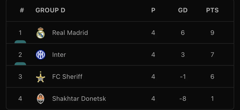 Với kết quả này, Real Madrid giữ vững ngôi đầu bảng D sau 4 vòng đấu với 9 điểm, Inter Milan xếp thứ hai với 7 điểm. Dù thua Inter Milan 1-3 trên sân nhà, nhưng Sheriff vẫn có cơ hội đi tiếp khi đội bóng này đứng vị trí thứ ba với 6 điểm.