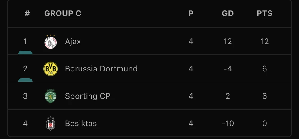 Tại bảng C, Ajax đánh bại chủ nhà Dortmund với tỷ số 3-1, Sporting CP thắng đậm đại diện đến từ Thổ Nhĩ Kỳ là Besiktas với tỷ số 4-0. Qua 4 lượt trận, Ajax xem như giành vé sớm khi có được 12 điểm, Dortmund đứng thứ hai với 6 điểm, Sporting CP dù cùng điểm số với Dortmund nhưng đứng thứ ba vì thua Dortmund thành tích đối đầu.