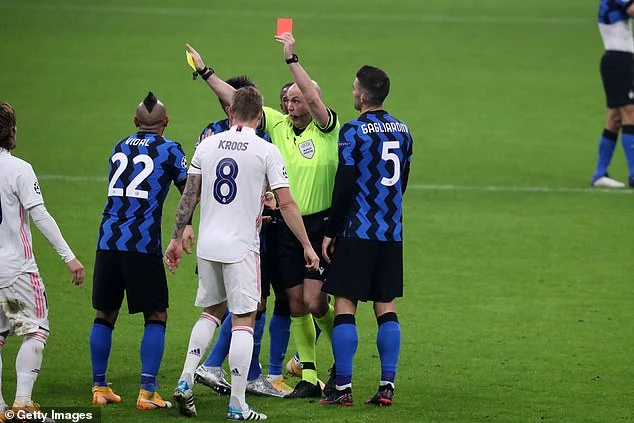 Phút 33, Inter Milan tự làm khó mình khi chỉ còn chơi với 10 người. Arturo Vidal đã phản ứng gay gắt với trọng tài đòi 11m và phải nhận liền hai chiếc thẻ vàng liên tiếp vì lỗi phản ứng. Chơi thiếu người, Inter đã khó càng gặp khó hơn.