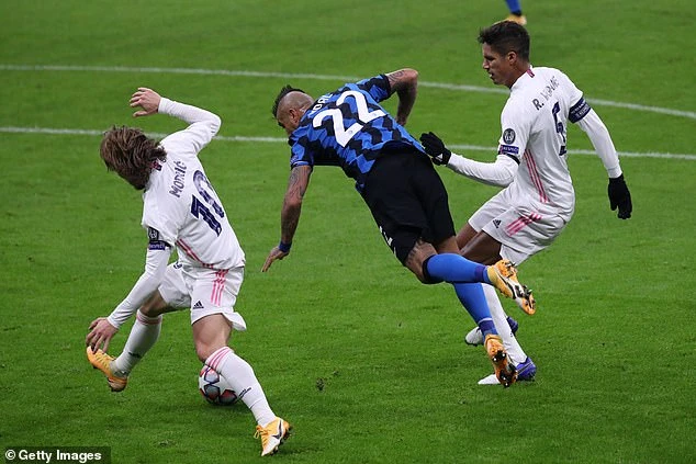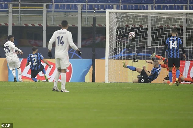 Chỉ ít phút sau, khung gỗ Inter Milan rung lên bần bật sau cú dứt điểm chạm xà ngang của Lucas Vazquez. Real thi đấu trên chân và áp đảo, thủ môn Handanovic chơi cực kỳ xuất sắc nhiều lần giải nguy cho Inter Milan.