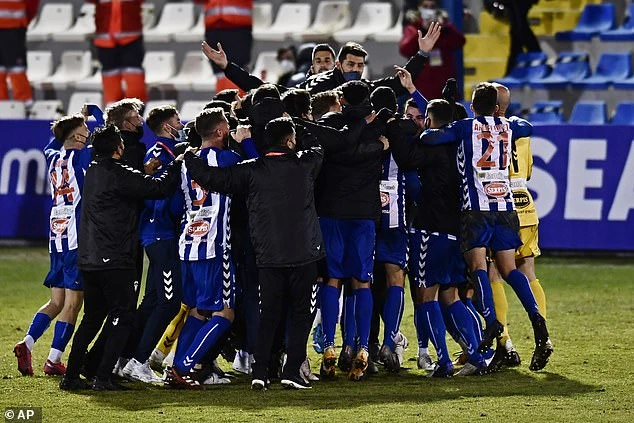 Cầu thủ Alcoyano ăn mừng trận thắng lịch sử. ẢNH: AP