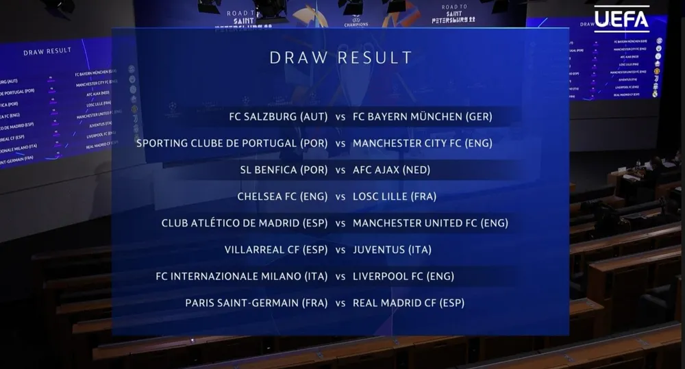 | Kết quả bốc thăm lần đầu vòng 1/8 Champions League: Benfica - Real Madrid Villarreal - Man. City Atletico Madrid - Bayern Munich RB Salzburg - Liverpool Inter Milan - Ajax, Sporting - Juventus, Chelsea - Lille PSG - Man. United Kết quả bốc thăm lại vòng 1/8 Champions League: Red Bull Salzburg - Bayern Munich Sporting Lisbon - Manchester City Benfica - Ajax Chelsea - Lille Atletico Madrid - Manchester United Villarreal - Juventus Milan - Liverpool PSG - Real Madrid |