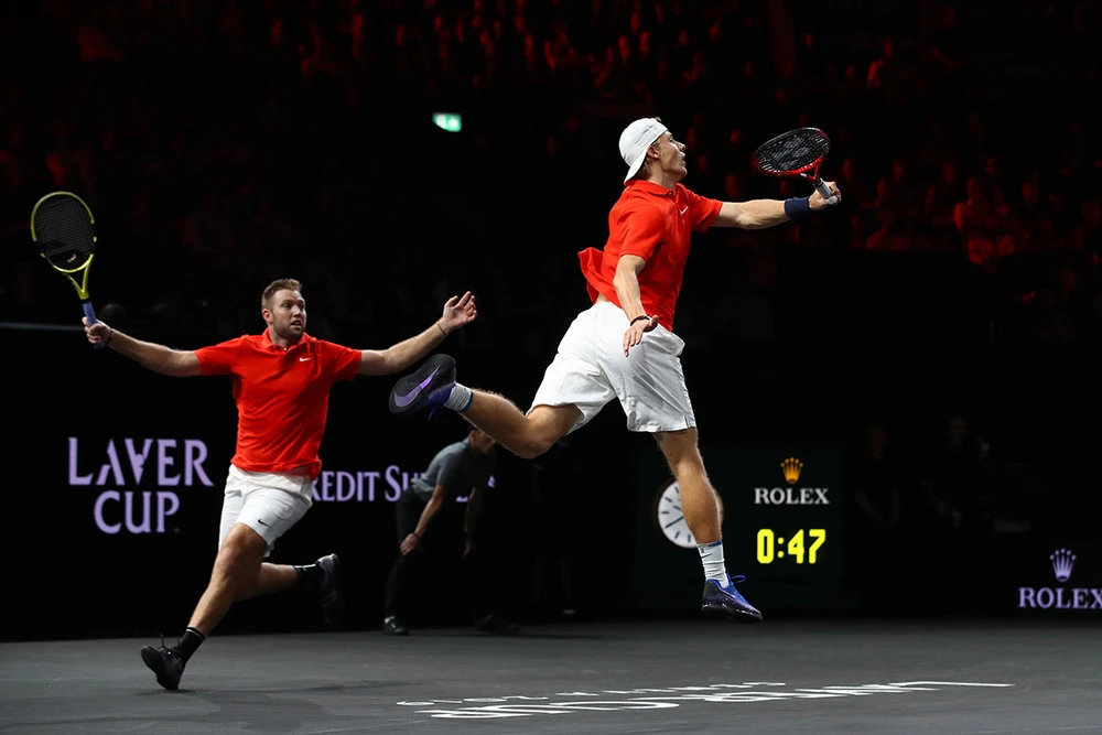 Federer cùng Zverev, đại diện Team Euro, đánh bại đôi Jack Sock - Shapovalov thuộc Team World. ẢNH: LVC
