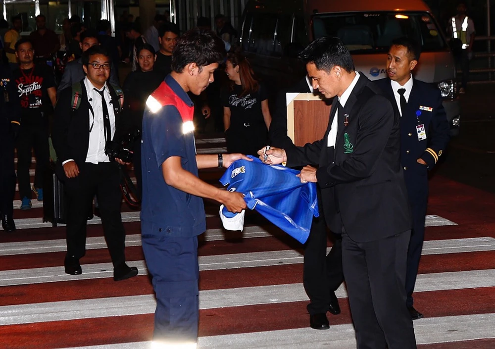 HLV Kiatisak điềm tĩnh ký tặng người hâm mộ tại sân bay sau khi thua Indonesia