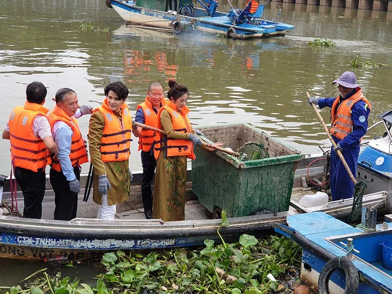 Các nghệ sĩ cùng chung tay vớt rác ở kênh Nhiêu Lộc - Thị Nghè. Ảnh: N.CHÂU