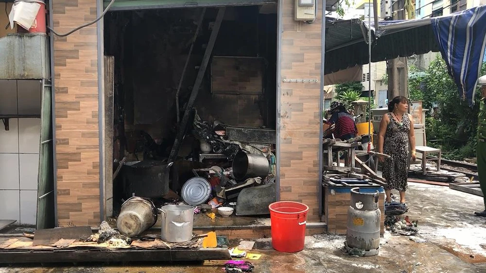 Hỏa hoạn bùng phát dữ dội từ căn nhà đồng thời là tiệm bán đồ ăn khiến nam nhân viên thay gas bỏng nặng. Ảnh: HT