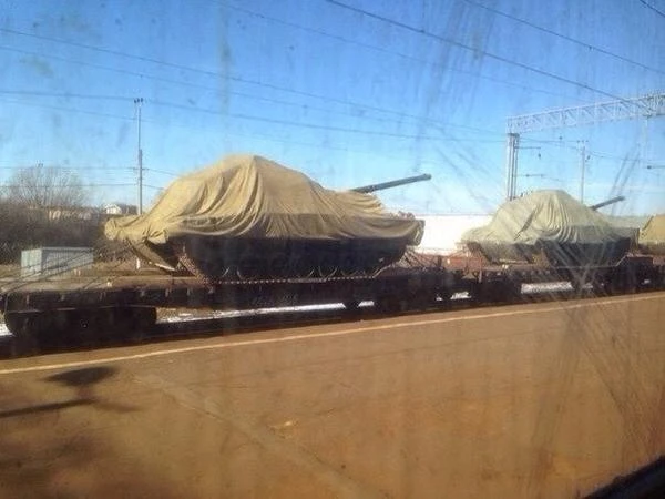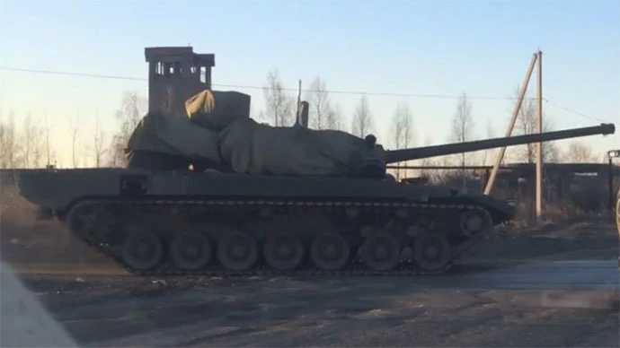 Các tháp pháo xe tăng được che phủ bằng vải, nhưng vẫn có thể dễ dàng nhận diện được mẫu xe tăng “tối tân” của Nga với thiết kế 7 bánh.