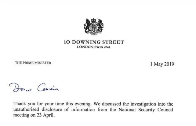 Bà May cho biết vụ rò rỉ thông tin từ cuộc họp ngày 23-4 là "một vấn đề cực kỳ nghiêm trọng và gây thất vọng sâu sắc" theo BBC. "Không có lời giải thích khác đáng tin cậy để nói về vụ rò rỉ này đã được xác định này".
