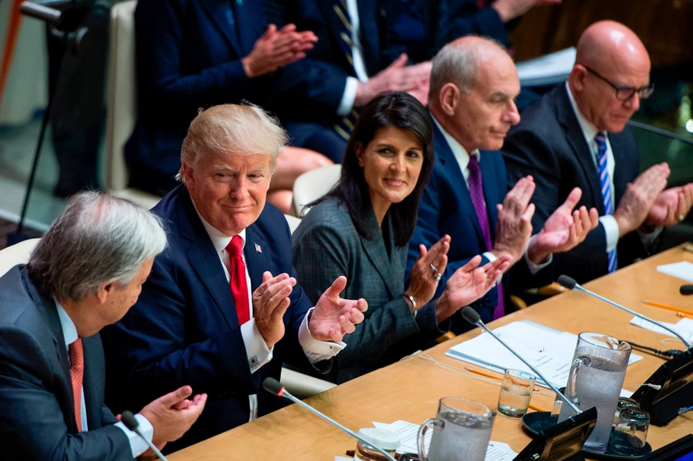 (Từ phải sang): Cố vấn An ninh Quốc gia H.R. McMaster, Chánh Văn phòng Nhà Trắng John Kelly, Đại sứ Mỹ tại LHQ Nikki Haley, Tổng thống Mỹ Donald Trump trong phiên họp về cải tổ LHQ tại New York ngày 18-9-2017. Ảnh: GETTY IMAGES