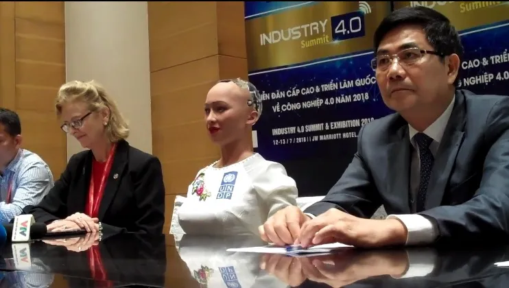 Trả lời câu hỏi Việt Nam cần làm gì để không tụt hậu trong thời đại cách mạng công nghiệp 4.0?, Sophia nói: Tôi là người đại diện cho kỷ nguyên cách mạng 4.0. Việt Nam cần có sáng tạo về công nghệ để phát triển bền vững nhanh hơn. Chính phủ Việt Nam đang đi đúng hướng, khai thác đúng mức phù hợp trong bối cảnh Internet phổ biến. Công nghệ giúp Việt Nam có bước nhảy vọt về năng suất lao động, các hoạt động kinh tế.