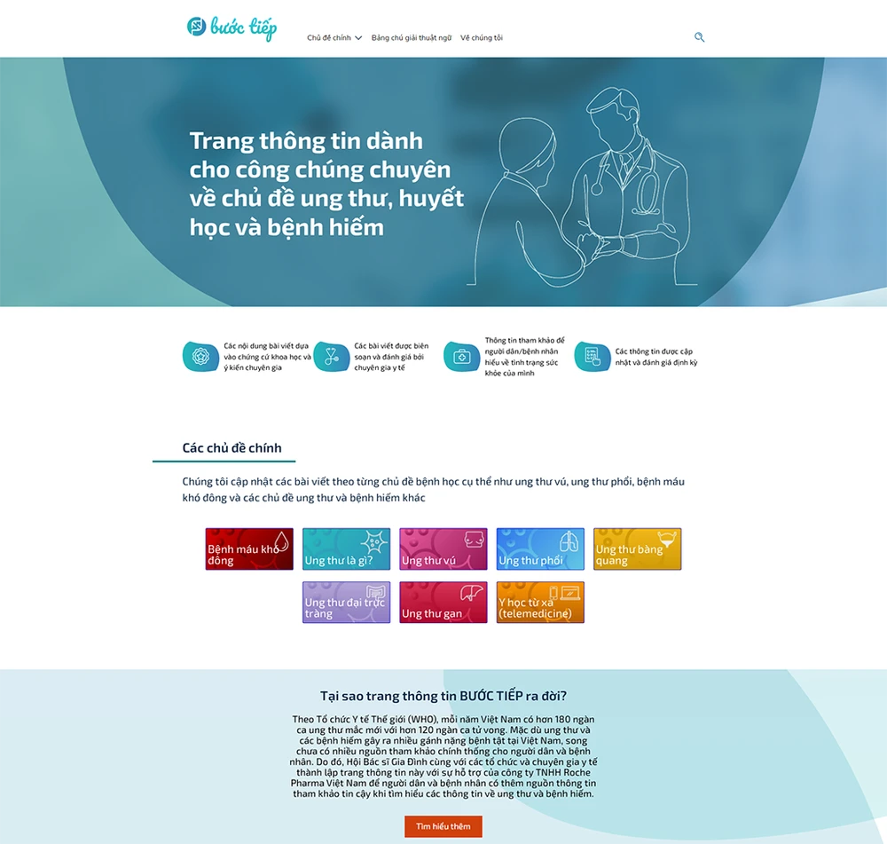 “Với tôn chỉ đặt bệnh nhân làm trọng tâm, chúng tôi hy vọng trang thông tin buoctiep.vn sẽ góp phần hỗ trợ bệnh nhân tiếp cận được nguồn thông tin cập nhật, đầy đủ, tin cậy chính xác. Qua đó, góp phần cải thiện hiệu quả điều trị bệnh, tăng cường thời gian và chất lượng sống cho bệnh nhân”, ông Lennor Carrillo, Tổng Giám đốc Roche Pharma Việt Nam chia sẻ.