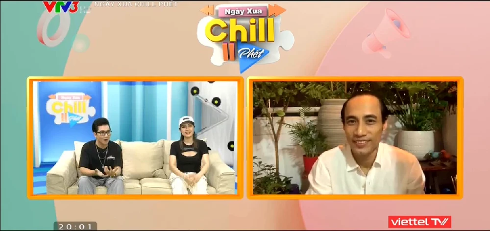 Ca sĩ, rocker Phạm Anh Khoa cùng MC Phí Linh và Công Tố tại “Ngày xưa chill phết”. Ảnh: Chụp màn hình.