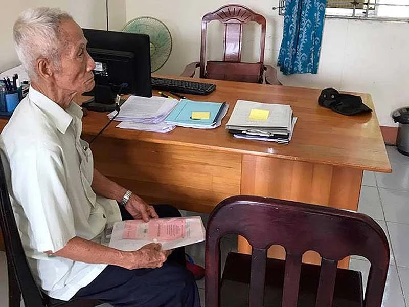 Ông Huỳnh Văn Truyện, cha ông Nén, đang nộp đơn tại TAND huyện Hàm Tân yêu cầu tuyên bố con trai mình mất năng lực hành vi dân sự. Ảnh: BPN