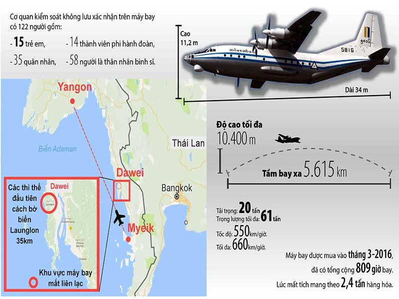 Infographic toàn cảnh thảm họa rơi máy bay vận tải quân sự Y-8 chở 122 người tại Myanmar. Đồ họa: THÙY TRANG